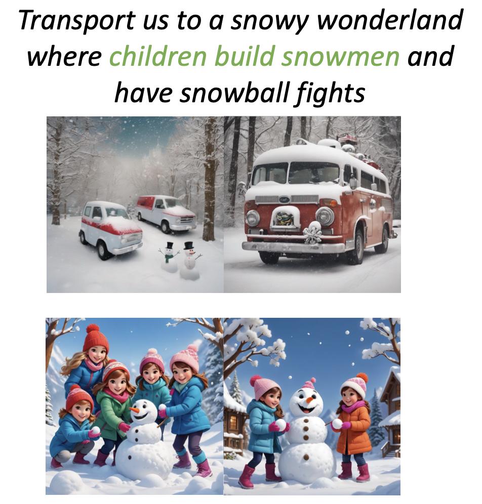 prompt:来,让我们一起去一个白雪皑皑的童话世界,那里有孩子们堆雪人和打雪仗