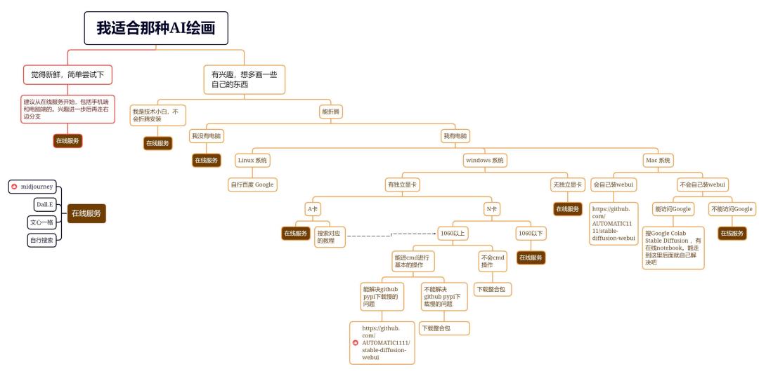 不过参照网友总结的这张AI绘图选择树,DiffusionGPT面向的人群应该还是想尝鲜和懒得折腾的技术小白。