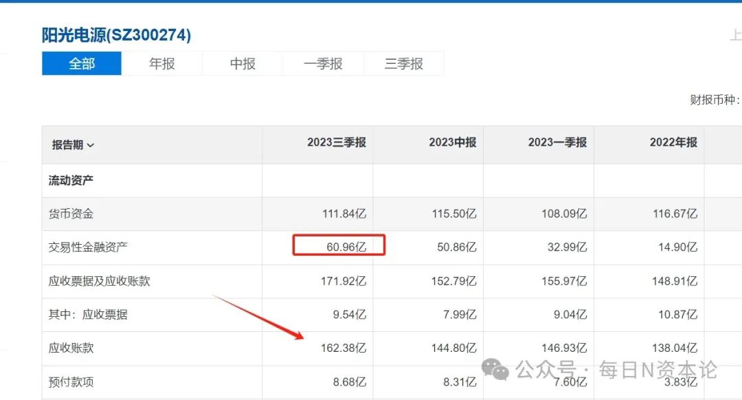 还有一个问题也需要注意。阳光电源似乎对理财的热情越来越高涨。2020年,其交易性金融资产为6.73亿元,2021年为38.13亿元,2022年为14.9亿元。2023年三季度这一个数据达到了惊人的60.96亿元,相当于将净利润84%拿出来理财。