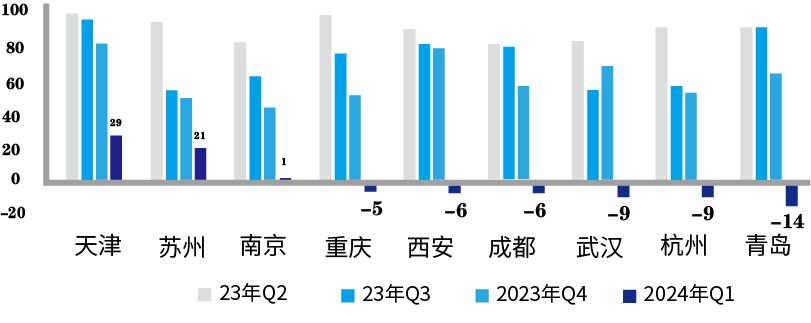 2024年Q1重点二线城市酒店市场业绩预期景气指数