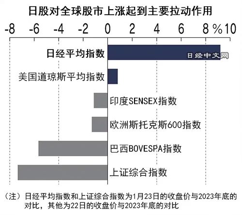 以日美欧等全球23个发达国家的上市股票为对象的MSCI发达国家指数(以当地货币计价,无分红)在1月19日时隔两年刷新最高点。随着日美股市上涨,该指数22日继续上涨。日经平均指数虽在23日小幅回落,但比2023年末上涨9%,涨幅在发达国家中非常突出。