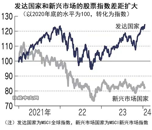 另一方面,MSCI新兴市场指数比2021年2月的最高点下跌了近3成。在经济前景不明朗的中国,上海证券综合指数在进入2024年以后下跌了7%,处于4年来的低点附近。