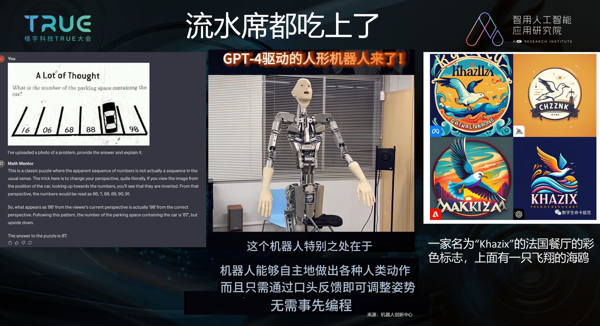 美的也大量的采用了这样的人工智能能力,美的智能建筑和智能家居已经十分智能,聊天的时候可以给你更多的帮助,这就是GPT4提供的能力。这一年过了之后,“流水席”就开始了,在当中抽了三样东西出来,第一个推理能力,人工智能原来没有推理能力,2022年之前我们认为人工智能傻傻的,是计算机视觉、听觉特别牛,能理解你的语言,但是他不具备推理能力,没有办法做推理链条;同时它也不具备泛化能力,也不具备多模态能力,可是去年一年这个领域快速发展,如图,下面这个车遮住的号码是几?数字是几?机器非常快速就能理解把图倒过来看的规律,核心能力是两样东西,一是GPT为代表的大语言模型能力,它可以全方位,无死角的看待同一个事实,这个事实摆在我们面前的时候,我们人都是有局限,都是有路径依赖,都是有盲区的。