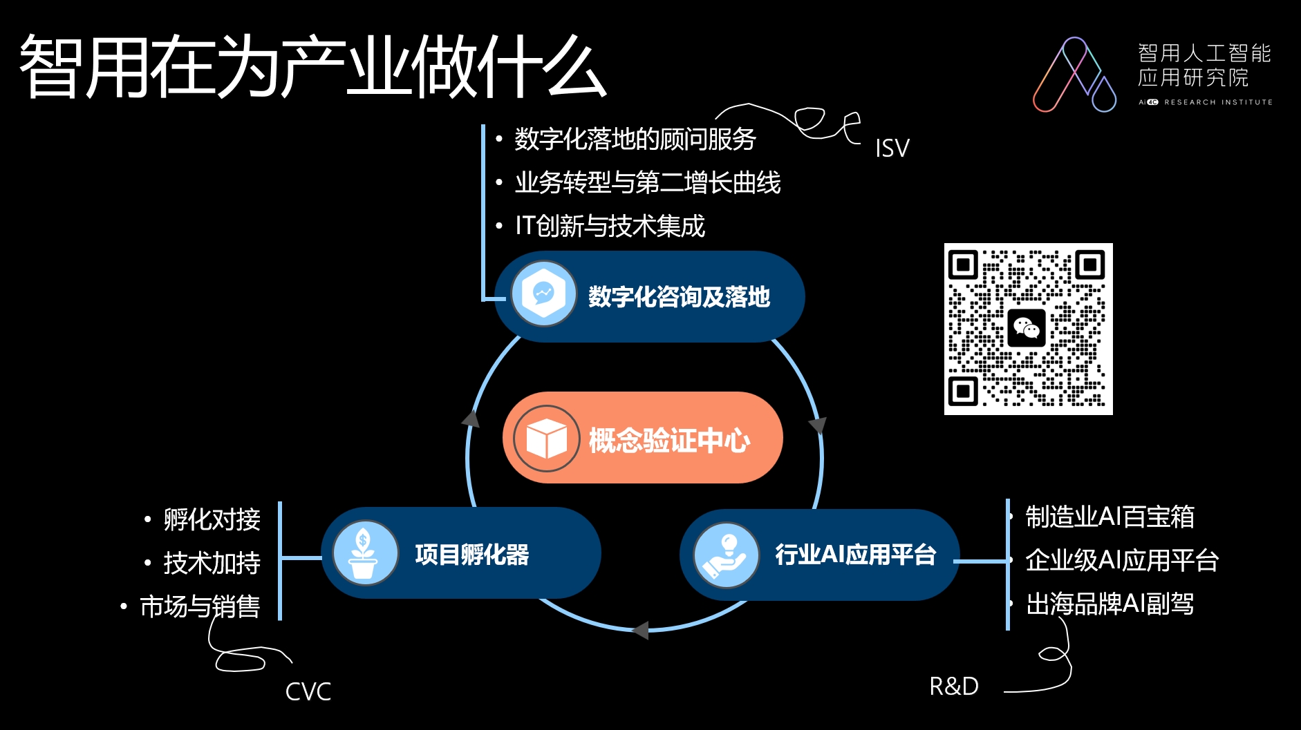 我们研究院做的事,一句话叫做科技、学术和产业中间是有条沟的,谁来负责,到底怎么转换?Open AI抛出了一个大“核弹”,并且每天仍在不断进步,可是如何应用到产业端,不知道,我们大家都不知道,但我们这个时候内心非常兴奋,兴奋点在哪?大量的事情可以做,人工智能涌现出的能力可以在各个行业生出花、结出果,光是细分的能源领域就可以有很多花样,可是这些事情怎么产业化,我们这波人一起成立了智用人工智能应用研究院,为前沿科技和传统产业搭一座桥。