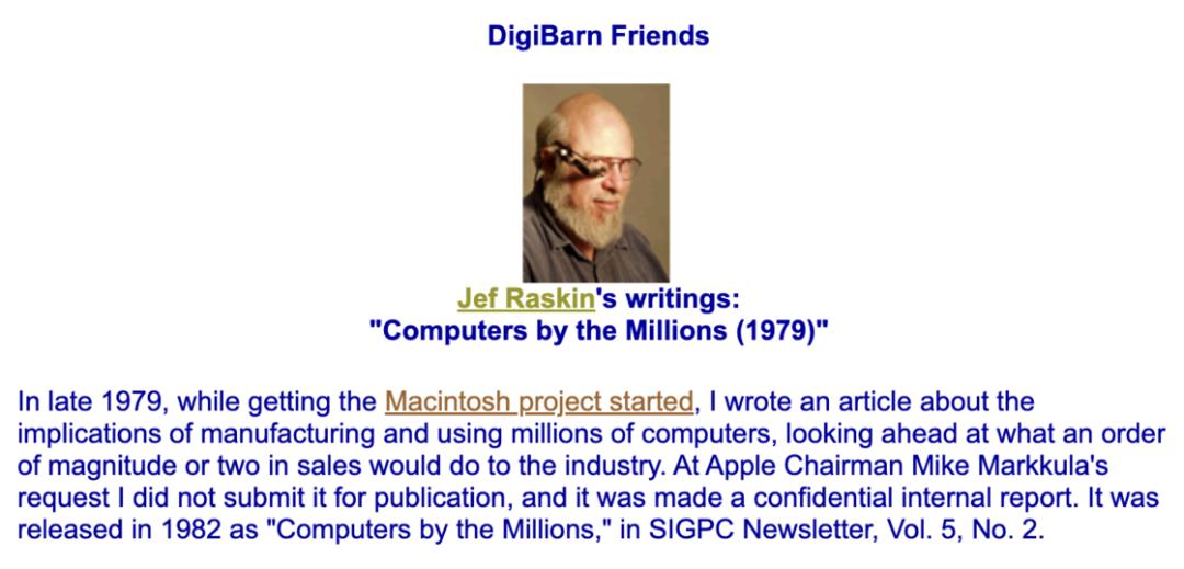 1981 年,因与乔布斯的性格冲突,Jef Raskin 离开了 Macintosh 团队。1982 年 Jef 正式离开苹果,成立了自己的公司,后来也开发了很多优秀的产品,并且在人机交互界面的设计领域建树颇高。