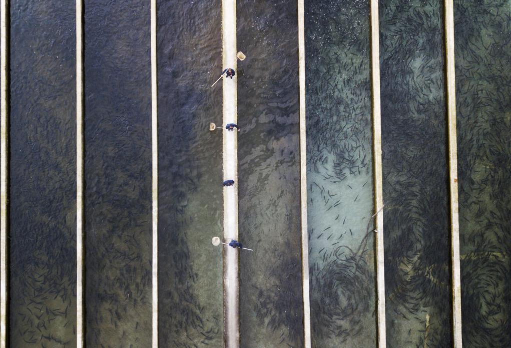 都江堰新联水产三文鱼体验中心,工作人员在进行养殖作业