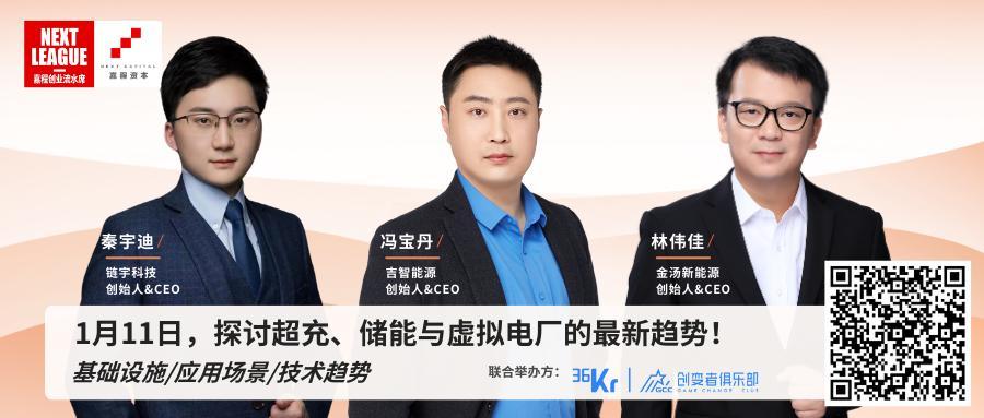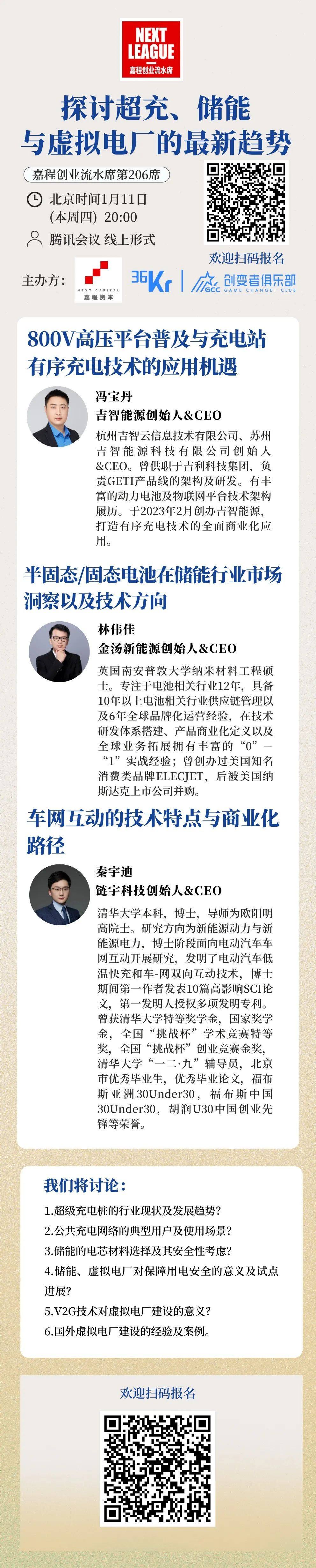 在电动汽车和储能领域,超充技术将会更加普及并不断提升性能,提供更快速、更高效的充电体验。而虚拟电厂则有望在电网调度中发挥更大的作用,为能源的可持续发展和清洁能源的普及提供更加坚实的支撑。2024年1月11日,本周四晚20:00,热爱创新的嘉程资本开启嘉程创业流水席第206席!我们邀请了吉智能源创始人&CEO冯宝丹、金汤新能源创始人&CEO林伟佳、链宇科技创始人&CEO秦宇迪,一起深度探讨超充、储能与虚拟电厂的最新趋势!欢迎各位新能源领域上下游的从业者、创业者、投资人和行业专家一起参加!