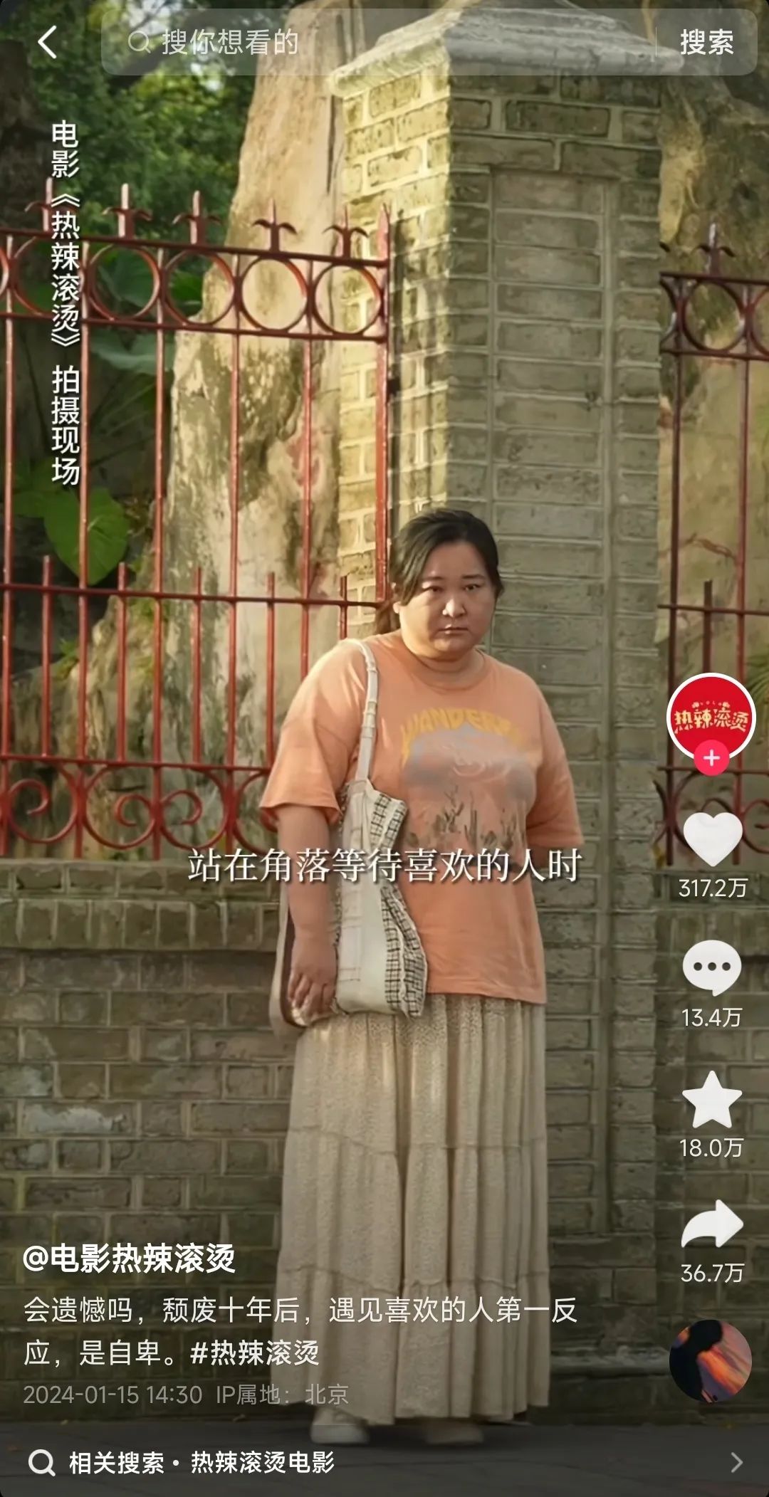 抖音上同样内容的这则视频点赞数达到315万,目前还在持续上涨,这也是@电影热辣滚烫账号赞数较高的一条视频。