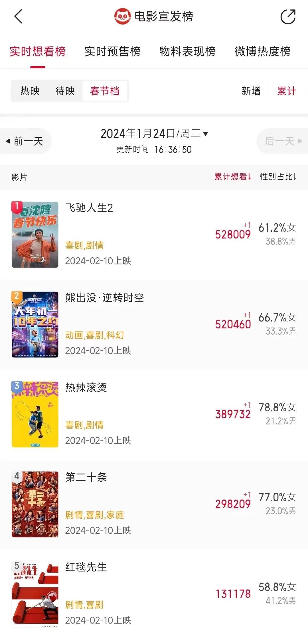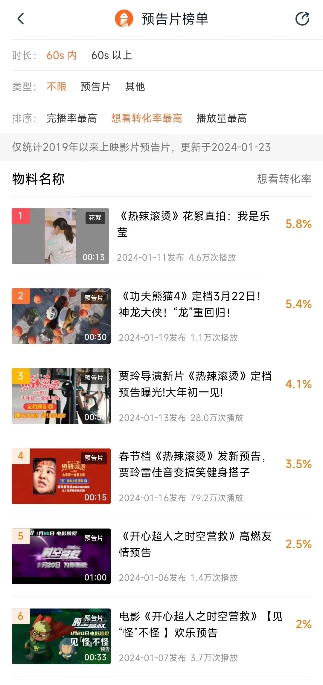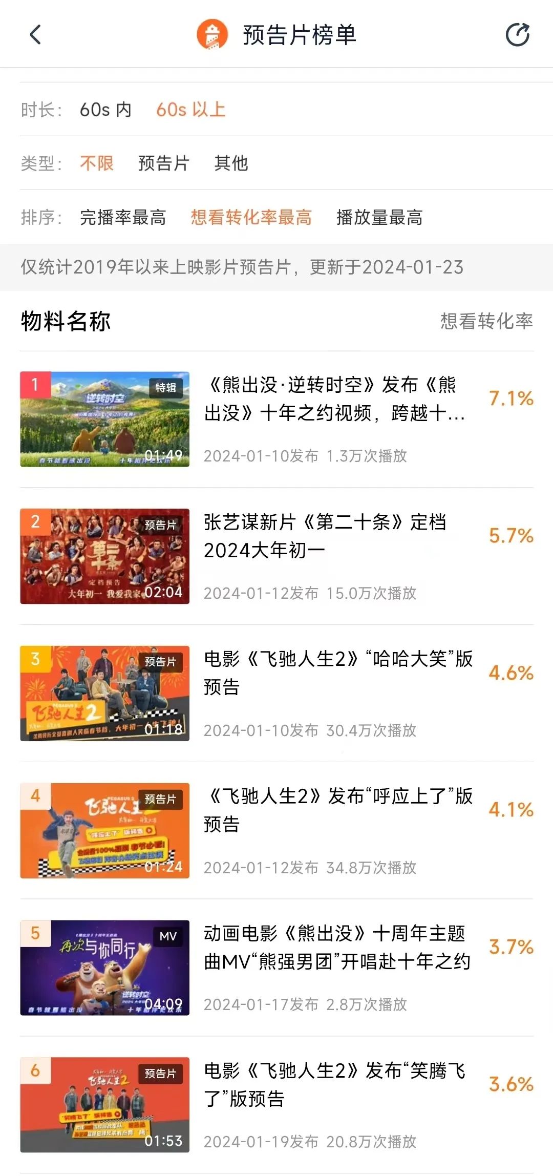 就“想看”转化率榜单来看,春节档的宣发中,《热辣滚烫》和《飞驰人生》都占了3条,其次是《熊出没·逆转时空》,再次是《第二十条》。