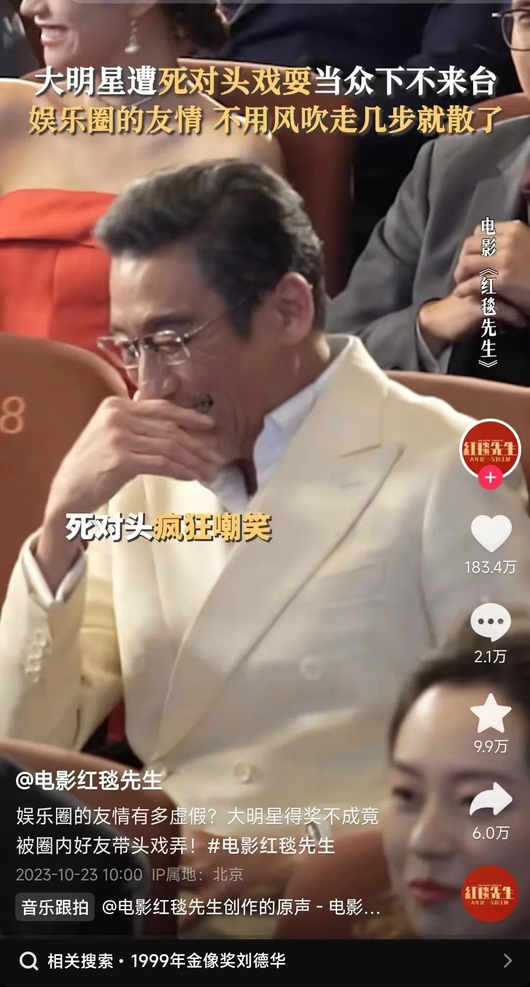 点赞量较高的视频都抓住了“死对头戏耍”“颁奖的尴尬时刻”等冲突点吸引眼球,但由于电影题材与演员本人经历太过贴近,不少路人会将视频内容当做刘德华的自身经历,电影官抖被质疑用电影片段掐头去尾误导路人,有损演员名誉。