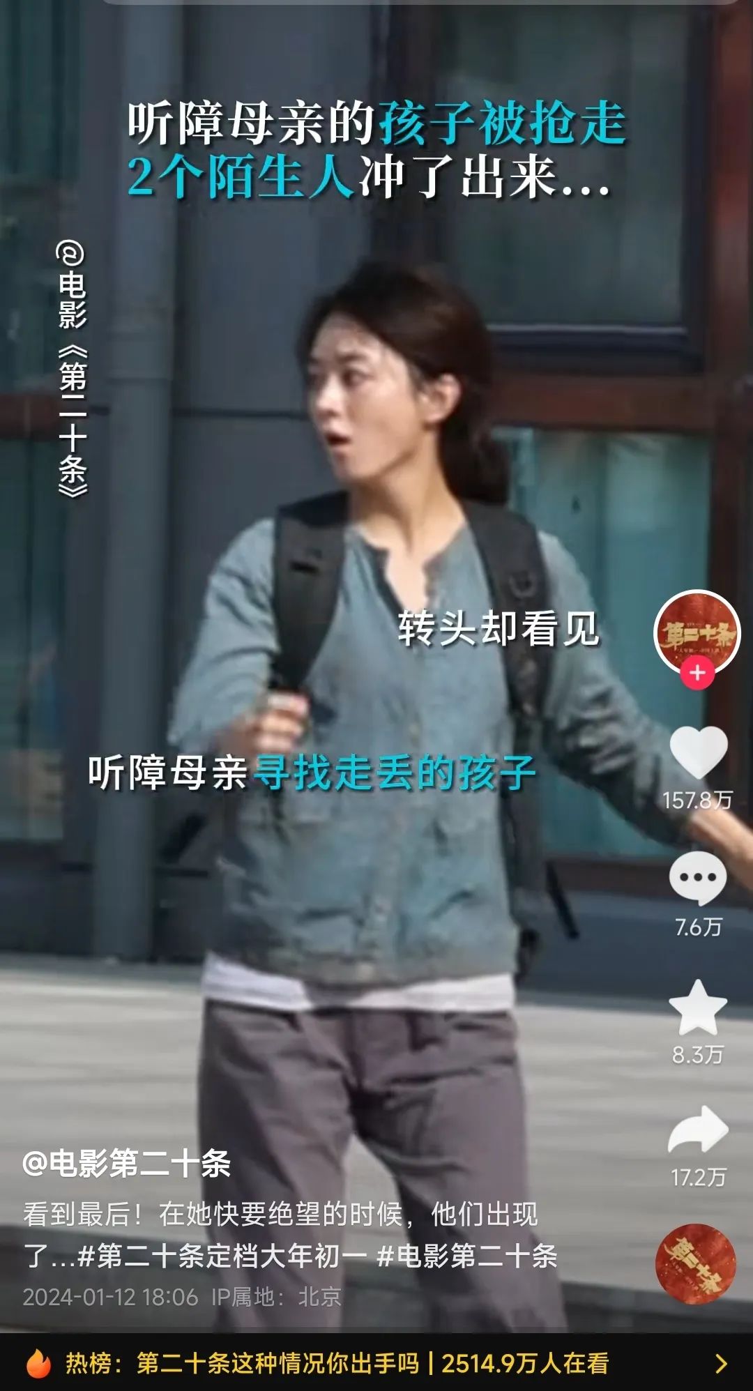 官抖破百万的视频内容是赵丽颖饰演的听障母亲孩子被抢走,生动的表演和周围路人的冷漠看得人十分揪心,该视频凭借演员转型的热度和拐卖儿童的社会议题获得了关注。