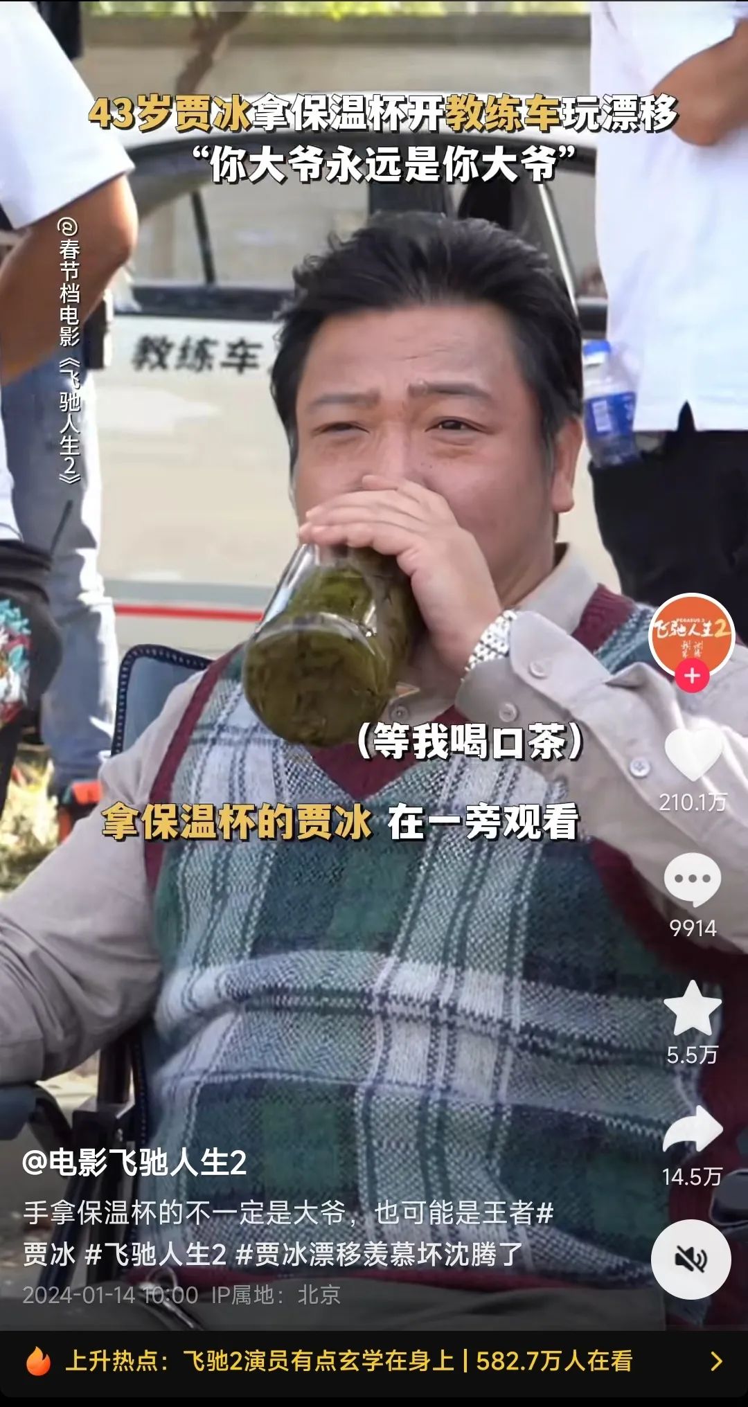 目前《飞驰人生2》的宣发走的是接地气路线,点赞量最高的视频内容主题为“43岁贾冰拿保温杯开教练车玩漂移,‘你大爷永远是你大爷’”。摸准了这种类似“深藏不露随后逆袭打脸”的爽文风格,在吸引用户评论互动的同时,仍然贴合赛车主题,体现出演员的专业能力。