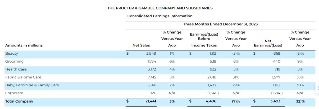 1月23日晚间,宝洁集团公布了2024财年第二季度(2023年10-12月)财报。报告期内,宝洁净销售额为214.41亿美元(约合人民币1538亿元),同比上涨3%;净利润为34.93亿美元(约合人民币250亿元),同比下滑了12%。