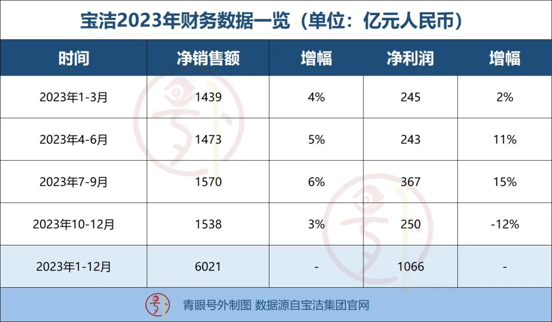 青眼号外梳理发现,2023年四个季度,宝洁集团分别实现净销售额1439亿元、1473亿元、1570亿元和1538亿元;实现净利润分别为245亿元、243亿元、367亿元和250亿元。