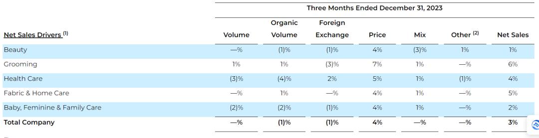 上文也提及,宝洁对2024财年Q2五大业务部门业绩增长的总结,“价格上涨”也是最核心的关键词。具体来看,报告期内宝洁集团整体出货量下降了1%,但价格同比上年同期上涨了4%。