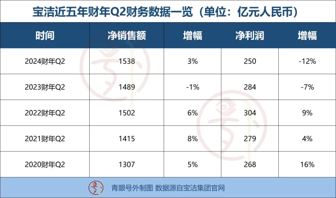 青眼号外随之梳理发现,这是宝洁公司近五年来首次在Q2出现净利润的双位数下滑。据宝洁财报数据显示,2023年10-12月,宝洁净销售额约为1538亿元,比去年同期的1489亿元上涨了3%;净利润则为250亿元,同比下滑了12%,净收益额甚至落后于2020财年Q2(2019年10-12月)。