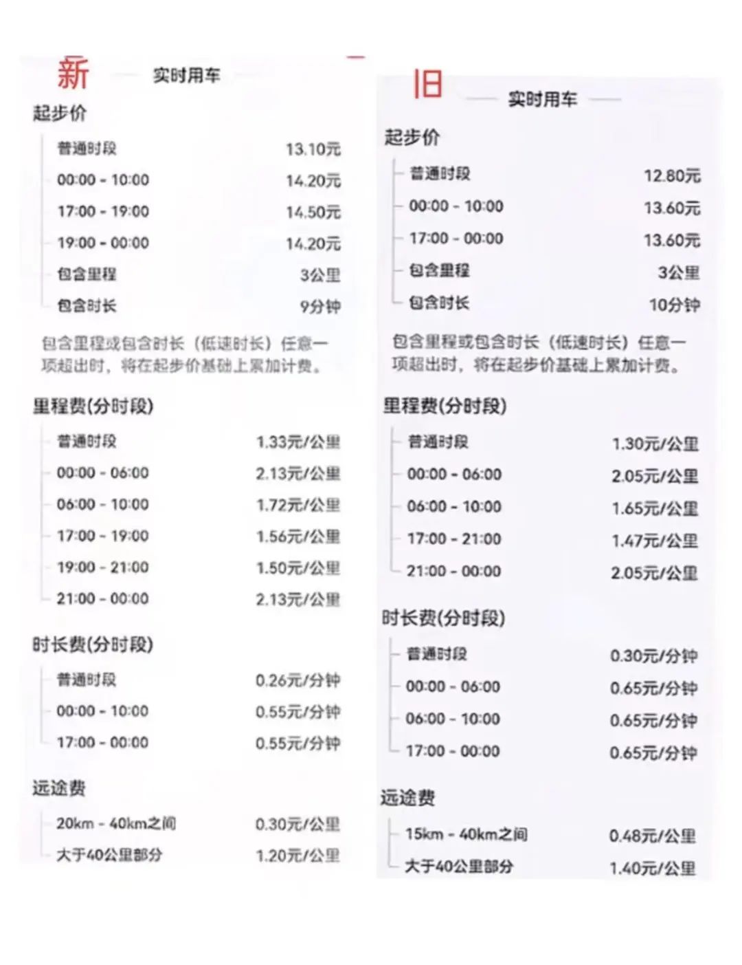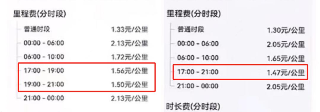 计价规则显示,平峰期的里程费由原来的1.3元/公里涨到了1.33元/公里。早高峰(6点-10点)的价格由原来的1.65元/公里涨到了1.72元/公里。夜高峰(晚5点-9点)被分成了两段,下午5点-7点的价格由原来的1.47元/公里涨到了1.56元/公里,其中晚上7点-9点的里程费则涨到了1.50元/公里。晚9点到次日早上6点的里程费从原来的2.05元/公里涨到了2.13元/公里。
