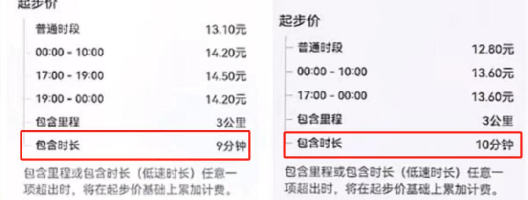 从图上我们可以看到,普通时段(也就是平峰期)的起步价从原来的12块8涨到了13块1。高峰期的起步价则从原来的13块6涨到了14块2。下午五点到七点之间这两个小时的高峰期起步价则涨到了14块5。起步价包含的里程不变,包含的时长则从10分钟降到了9分钟。
