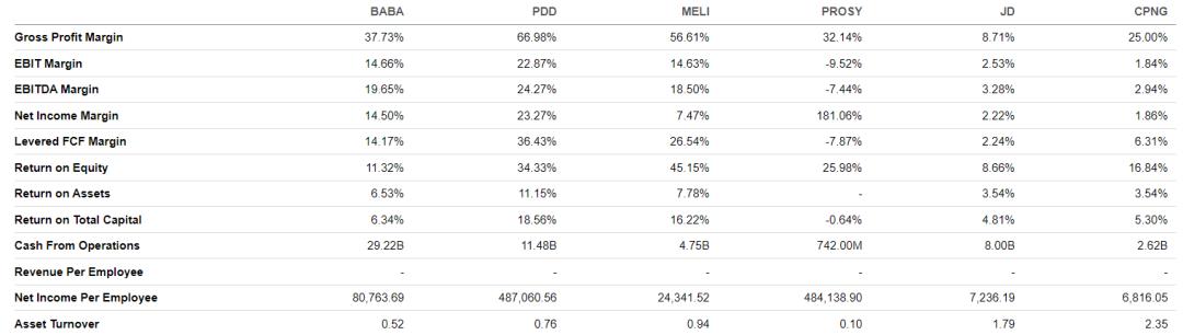 在这里,我们选取了几家中国的电商平台——阿里、京东和拼多多,以及海外的MercadoLibre(MELI,拉丁美洲电商平台)、Coupang(CPNG,韩国电商平台)和Prosus(PROSY,科技投资公司)作对比。