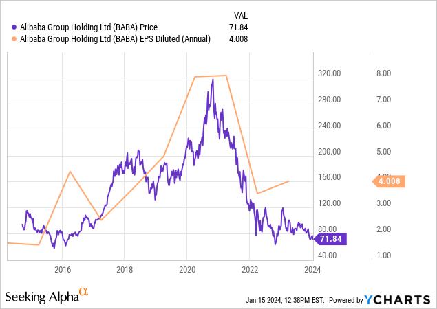 更何况,从每股摊薄收益(EPS_D)这个指标看,早在2022年之后,这项指标就已经大幅跑赢了阿里的股价。可以说,无论从哪个指标上看,过去一年甚至数年时间内,阿里包括盈利能力、现金流量等等在内的基本面情况,都是相当健康甚至算得上表现优异的。