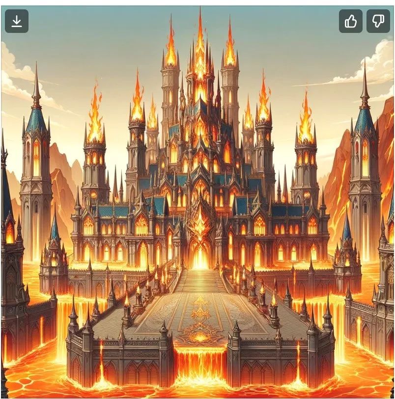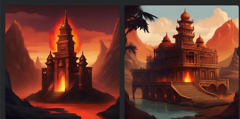 对 Fotor 生图功能的测试,上图 Fotor 生成,下图 ChatGPT 生成(提示语为“火焰领主的宫殿,拥有华丽的尖塔和熔岩护城河,我需要的是一个正面的效果图,游戏插画风格”),可以看到 Fotor 是有垂类图片产品的“尊严”在的,美感基本在线,说明公司在图片领域的技术储备是不错的,但模型对于语言的理解差点意思,“正面”、“熔岩护城河”等元素都被忽略掉了。