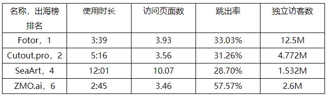 因为榜单是按照流量去排列的,也就是人数 X 访问次数,与排名第二的 Cutout.Pro 相比,Fotor 网站流量只高了 23%,但独立访客数却高了 2.5 倍。如果按照独立用户数排名,Fotor 大概排到全球 15、16 名的位置。创始人透露,Fotor 的全球 MAU 超过了 2000 万,网站流量 1 年内翻了 6 倍。Fotor 吸引了广泛受众,但另一面也就是说,黏性并不是那么强,每个人访问次数并没有很高。
