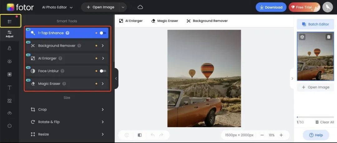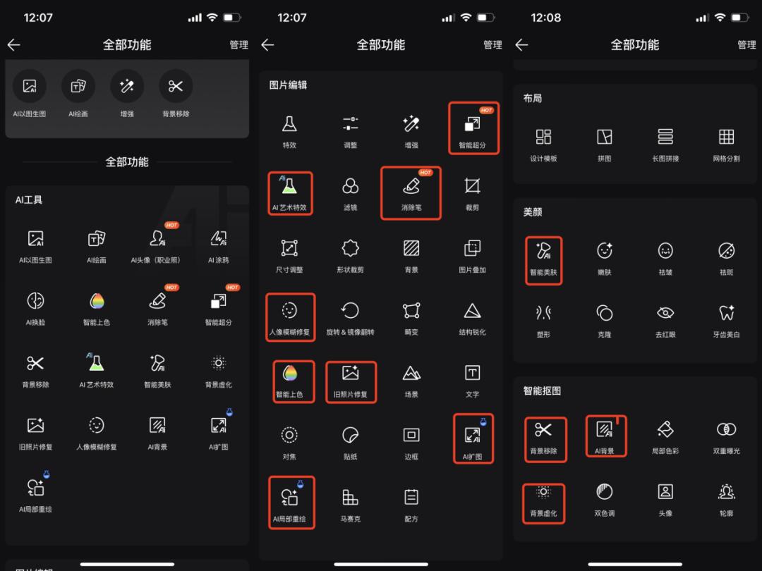 Fotor 功能一览,注:为直观体现 Fotor 的所有功能,这里使用的是 App 端的截图,红框中是 AI 功能,左图是单列出的AI工具|图片来源:Fotor App