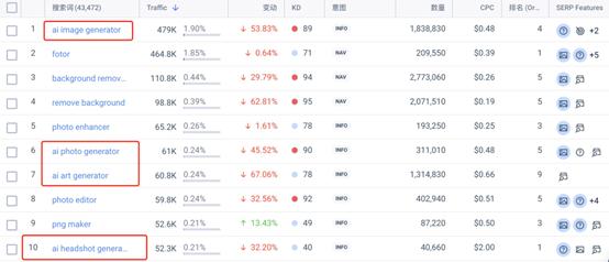Fotor 排名前 10 的搜索关键词,注:红框中 是AI 相关关键词|图片来源:Similarweb