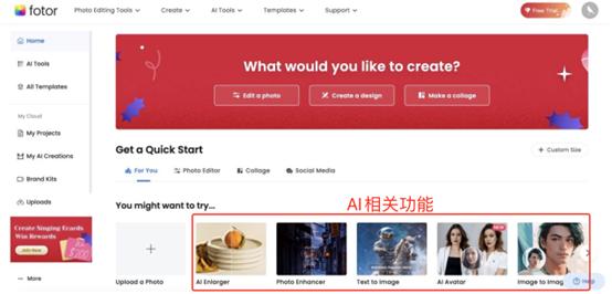 笔者用 Google 账号登录后,AI 有了更多展示,但依然不是最核心的位置,修图、设计、拼图,更显眼。在 Fotor 的规划中,AI 很重要(放在了 Home 标签下的第一个标签),但不是最重要(AI 强相关功能放在了“你可能想尝试”版块,是一个承担尝新流量的作用),如其在做 SEO 时的思路,网站依然为图片编辑的主要场景提供服务。