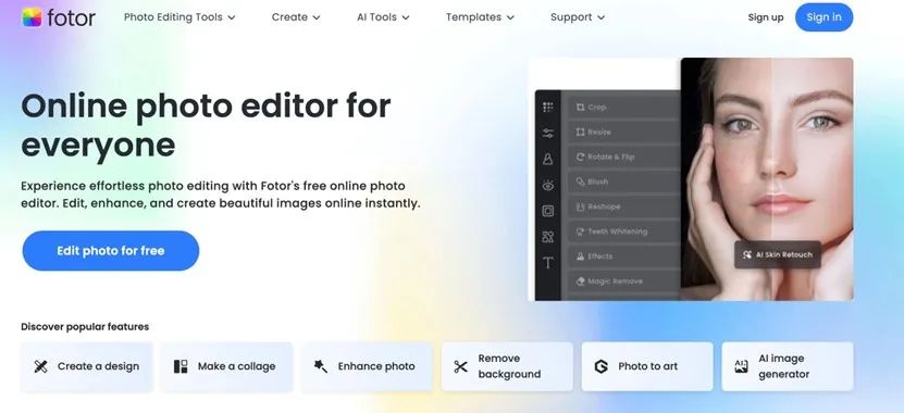 而打开 Fotor 的网站,你会发现,他的 SEO 做得很好的一个原因是,Fotor 确实提供上述全部功能,并放在了很显眼的位置,虽然上的是 AI 产品出海榜,但 Fotor 看上去和之前的修图网站非常像,只是多了 AI 绘画。