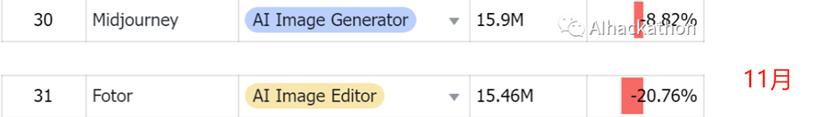 而把比对范围拓宽至全球 AI 产品 Top100,Fotor 的成绩也不错。9 月和 10 月网站访问量一直能排在全球第 23 名,虽然 11 月和 12 月流量数据下降明显,但是仍能排在全球 30 多名,甚至流量一度和 Midjourney 差不多。