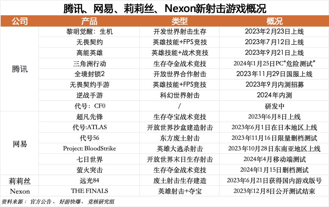 其二,在新世代射击+领域,国内各家厂商虽打法不一,但基本秉持两个大方向。竞技射击,挖掘玩法,如FPS+英雄技能、英雄射击+夺宝、大战场模式等;主打PVE或PVEVP类型的射击游戏,逐渐扩展内容、开放世界探索体验。