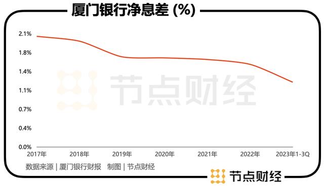 财报显示,2017-2022年,厦门银行的净息差由2.05%下降到了1.53%,并进一步下降至2023年前三季度的1.2%,在17家上市城商行中排在末尾。比如,2023年前三季度,宁波银行净息差为1.89%,苏州银行为1.71%、杭州银行为1.41%。