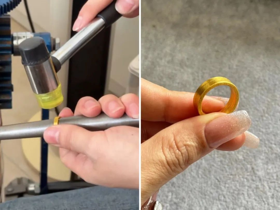 2024年1月,95后插画师观子(化名)用从银行购买的50克金条,在老家的打金店打了一对黄金古法素圈戒指,和一只素圈手镯。