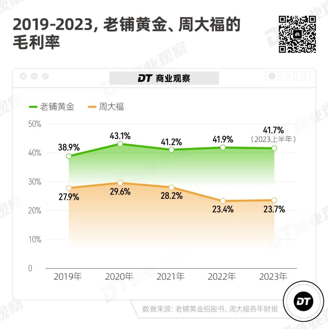 根据招股书,从2019年至2023上半年,老铺黄金的毛利率一直稳定在40%左右。