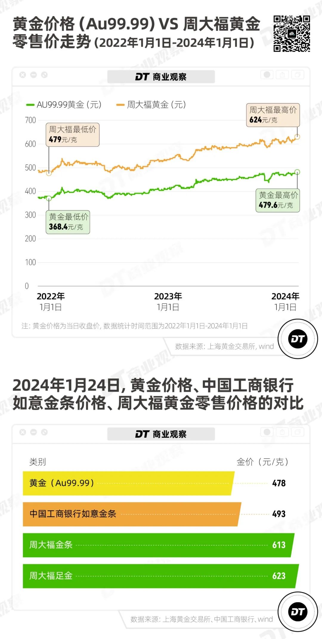 从2022年开始,黄金价格(Au99.99,即千足金)不仅一路走高,周大福的黄金零售价还平均比黄金价格贵30%左右,并在新的一年突破600元/克的高位。