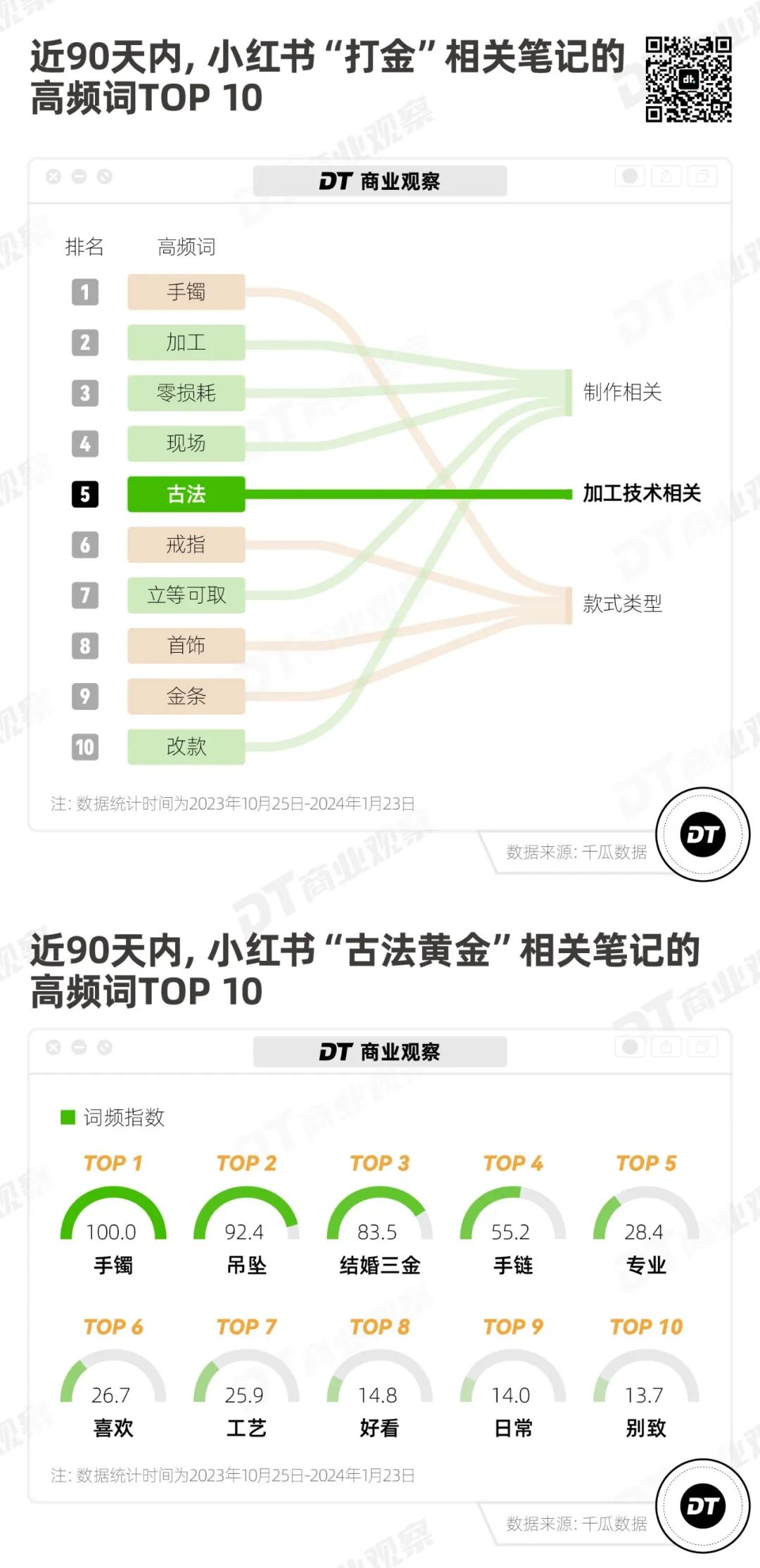 近90天里,小红书上“打金”相关的笔记有1.58万篇,除了打金制作过程和款式的高频词,“古法”是唯一上榜TOP 10的加工技术相关高频词。