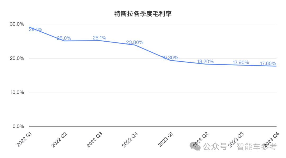 但众所周知,特斯拉前段时间还是在不断降价。所以就不难看到第四季度毛利率依旧走低,为17.6%,比上一季度降低0.3个百分点。
