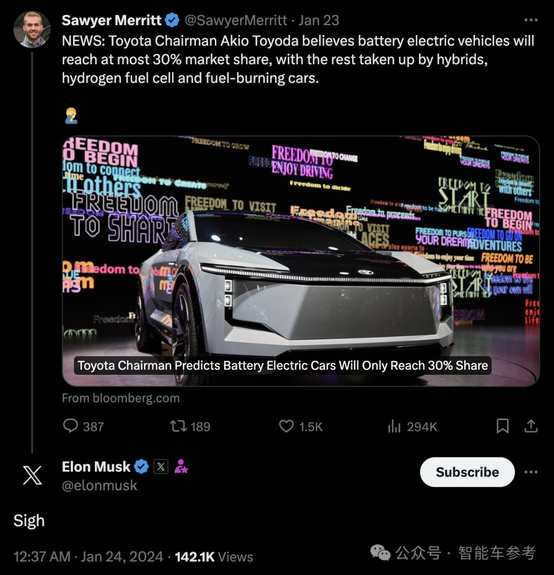 对于丰田章男的言论,马斯克在推特上转发了相关新闻,只回复了一个字:唉……