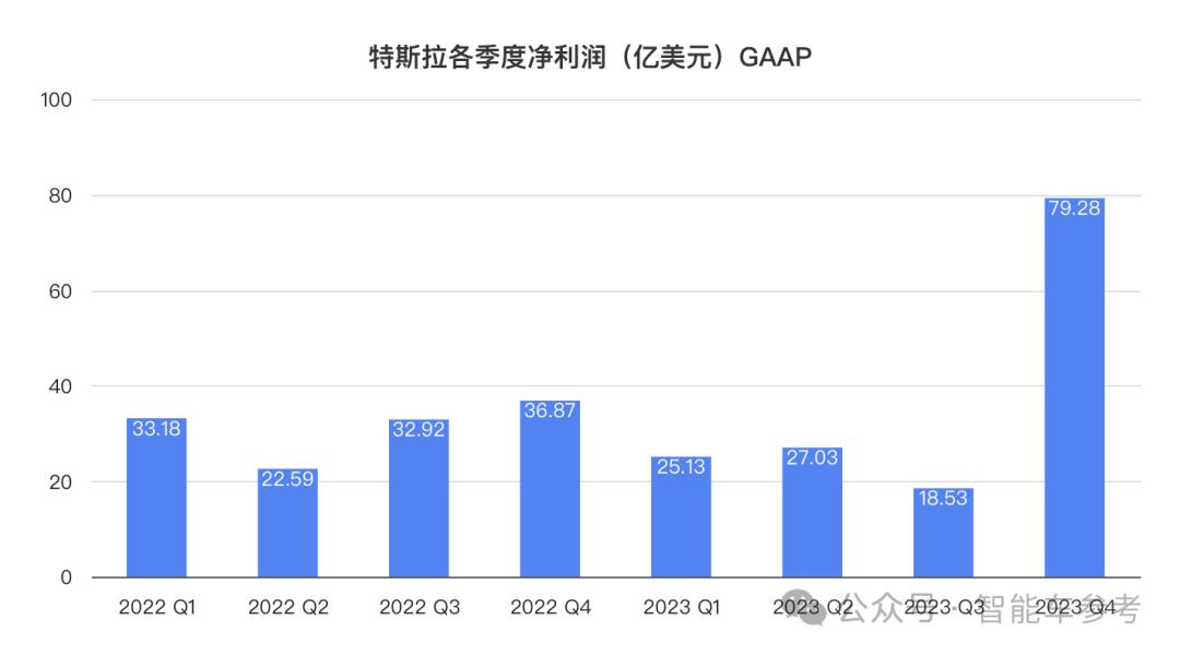 不过令人意外的是,根据美国通用会计准则(GAAP),特斯拉四季度净利润大涨,达到79.28亿美元(约567.73亿元)历史最高,同比增长115%,环比则增加327.8%。