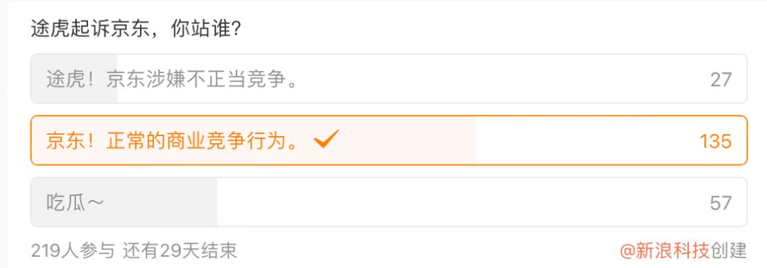 一个数据是,在新浪科技发起的话题投票中,选择“京东,正常的商业竞争行为”用户占比为62%,“吃瓜”用户比例为26%,支持途虎,认为“京东涉嫌不正当竞争”用户,占比仅为12%。