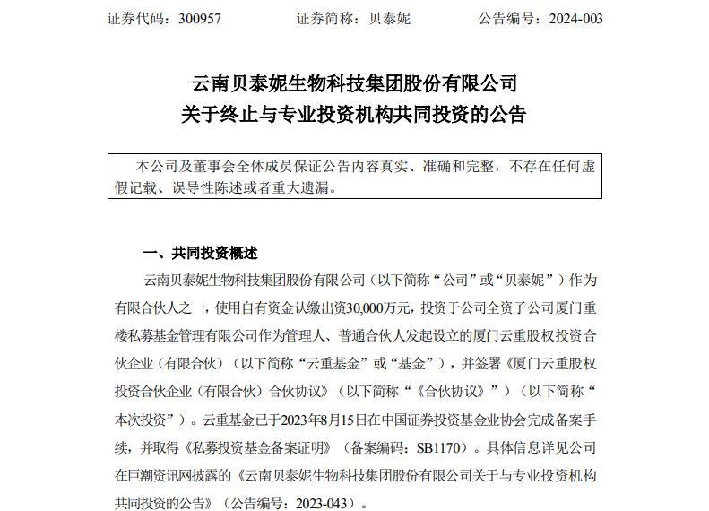 贝泰妮称,“受政策环境变化等客观因素影响,公司未以云重基金为主体进行相关投资,公司管理层综合考虑公司的业务发展规划,为优化资源配置、提高资金使用效率、维护基金合伙人及投资者的利益,与云重基金其他合伙人协商一致,决定提前终止《合伙协议》,清算并注销云重基金”。