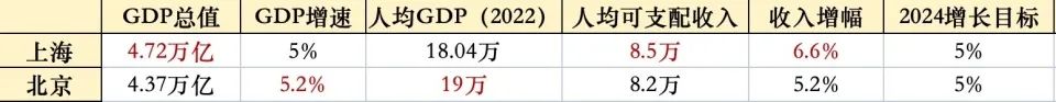 不过,上海的居民人均可支配收入高于北京居民。2023年,上海居民人均可支配收入达到8.5万元、增长6.6%,增速快于经济增长;北京居民人均可支配收入为81752元、同比增长5.2%,与经济增长持平。
