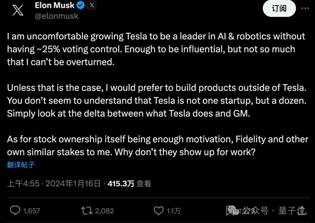 特斯拉发展成人工智能和机器人领军企业,而我却没有25%控制权,这令我不安。