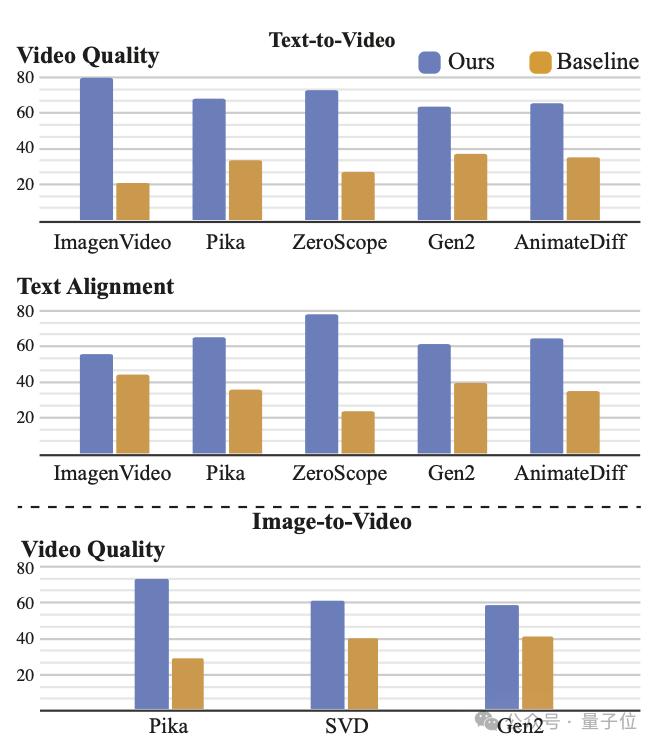 研究人员收集了大约400份反馈,结果显示,在视频质量、文本匹配度方面,Lumiere超越了Pika、Gen2、Imagen Video、SVD等一众顶级视频生成模型。
