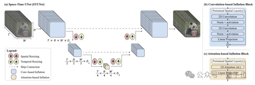 Lumiere的创新点在于,提出了时空U-Net(STU-Net)架构:将视频在空间和时间两个维度同时进行下采样和上采样,在网络的中间层得到视频的压缩时空表示。