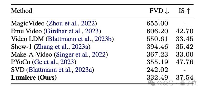 同时,在UCF101数据集(动作识别数据集)上,与MagicVideo、Make-A-Video、SVD等模型相比,Lumiere取得了具有竞争力的FVD和IS指标。