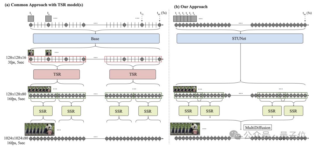 在此前的方法中,常见的做法是,扩散模型先生成一些稀疏的关键帧,而后通过一系列时间超分辨率(TSR)模型来填补关键帧之间的空白,接着再用空间超分辨率模型获取高清视频结果。
