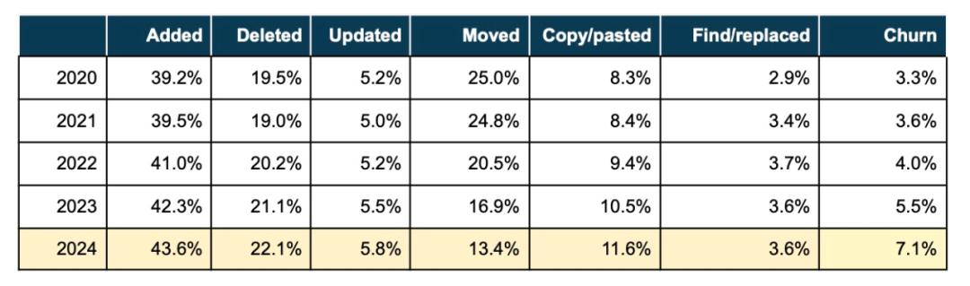 这项研究着眼于经过添加、更新、删除、复制及移动的代码,并排除掉 GitClear 预先定义的“噪音”,例如被提交至多个分支的相同代码、空行及其他无意义的代码行。