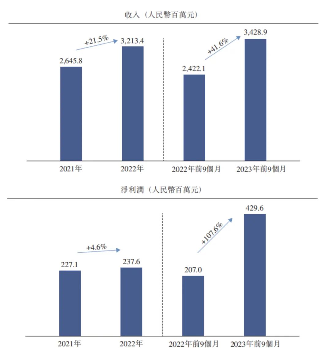 据招股书显示,小菜园门店数量以23.2%的复合年增长率保持快速增长,截至2024年1月11日,已经有548家直营门店;门店快速扩张的同时,营收也实现大增,不仅在疫情期间拿到了21.5%的增速,更是在2023年前三季度营收同比增长41.6%,由2022年同期的24.22亿元增长至34.29亿元;盈利能力方面,2021年、2022年净利润分别为2.27亿元、2.38亿元,2023年仅前三季度就拿下4.30亿元,较去年同期大增107.6%,净利率也由2021年的8.6%提升至12.5%,高于行业平均水平。